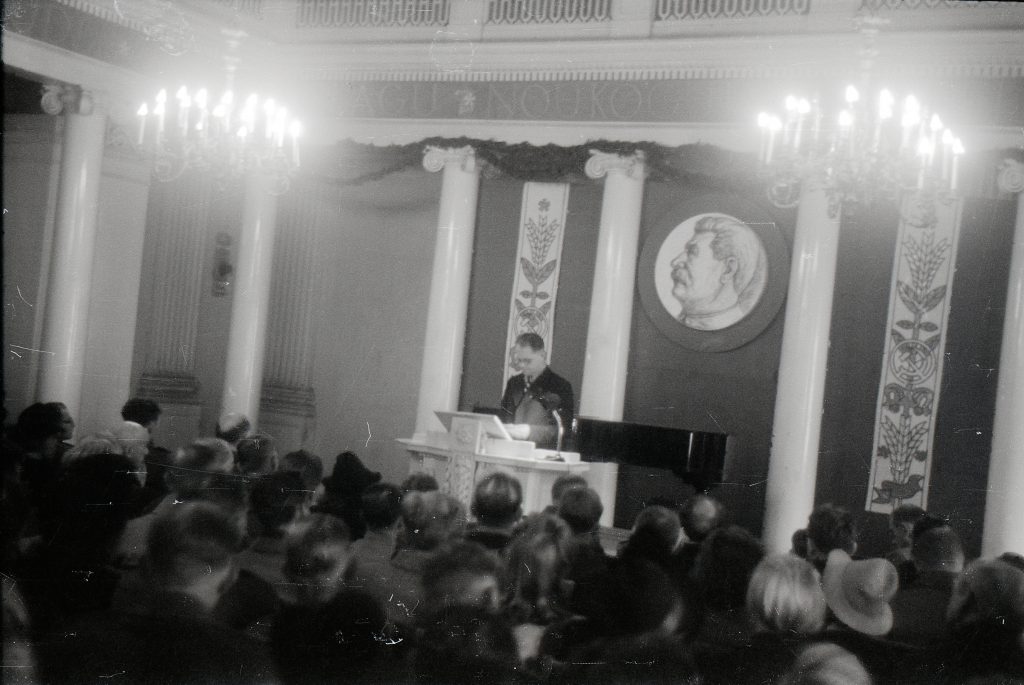 Hiljemalt 1952. aastast oli niši ette paigutatud suur Nõukogude Liidu diktaatori Jossif Stalini büst. Juba 1955. aasta lõpust pärit fotodel on näha, et nišš oli Stalini surma järel jällegi tühjaks jäänud. 1963. aastal toodi aulasse niši ette postament koos Nõukogude riigi rajaja Vladimir Lenini büstiga.