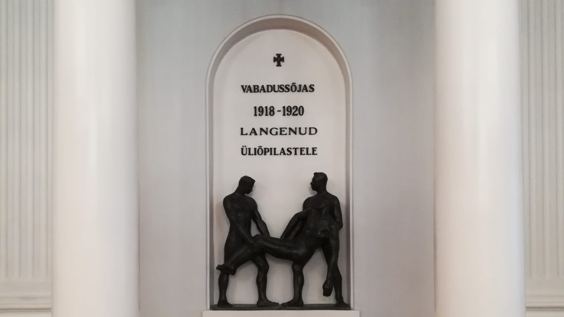 Rahvusülikooli 100. aastapäevaks taastas ülikooli rektoraat algkujul mälestusmärgi, mis oli püstitatud Tartu Ülikooli aulasse 1939. aastal. Kuigi Nõukogude okupatsiooni ajal maha võetud mälestusmärgist oli säilinud skulptuurigrupp, mis paigutati tagasi oma algsele kohale juba 1994. aastal, jäi toona taastamata selle juurde kuulunud pronksivalus mälestustekst „Vabadussõjas 1918–1920 langenud üliõpilastele“ ja selle kohal olnud Vabadusrist. Tekst koos ristiga taastati ja ennistati oma kohale rahvusülikooli juubeliaktuseks.